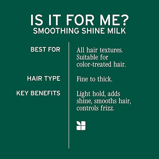 Obtén la máxima suavidad con Smooth Shine Milk. Esta ligera niebla proporciona una sujeción flexible, suaviza el cabello y evita el encrespamiento con un acabado brillante. Repara daños, aumenta el brillo y retiene la humedad.